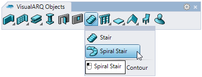 VisualARQ permite para crear escaleras de caracol. Cuando ejecute el comando vaEscalera, puede seleccionar la opción «Escalera de caracol» en la línea de comandos. O bien, puede hacer clic en el icono de escalera de caracol, en la barra de herramientas de escalera.