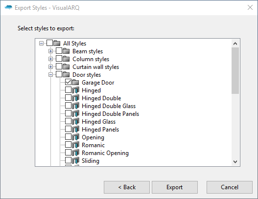 - Seleccione los estilos a exportar de la lista. Un archivo .val puede contener uno o varios estilos de diferentes objetos.