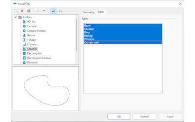 Create, edit, and delete custom profiles defined from curves. Select which object types are available for each profile.