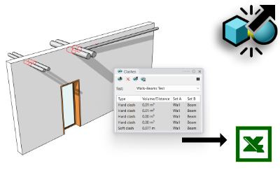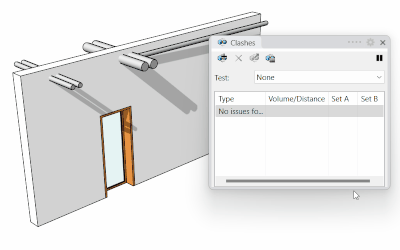 Find collisions and clearances between two sets of objects, and display them in the Clashes report panel. Highlight the objects involved and zoom to the issues.