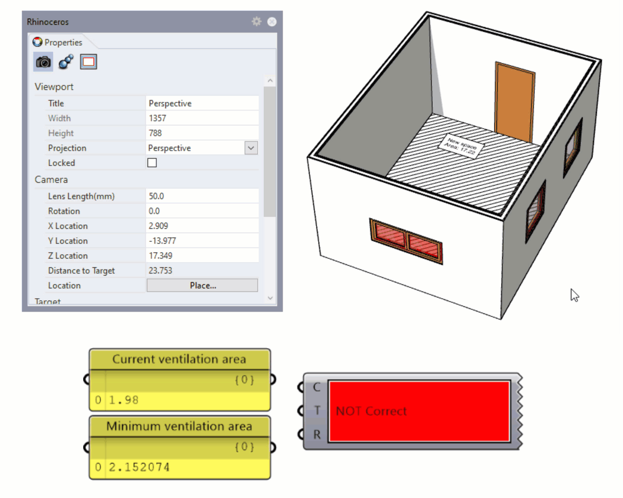 Vous pouvez utiliser les composants de VisualARQ pour Grasshopper pour vérifier automatiquement que votre projet répond aux réglementations. Créez vos propres scripts en fonctions des lois en vigueur sur les surfaces minimales de ventilation, les surfaces utiles minimales, les dimensions minimale et bien plus. Consultez ici un exemple montrant comment utiliser les composants de VisualARQ pour Grasshopper afin de vérifier que la réglementation sur la surface minimale de ventilation dans une pièce est respectée. Pour cet exemple, la réglementation appliquée est (Surface de ventilation) ≥ (Surface de la pièce)/8.