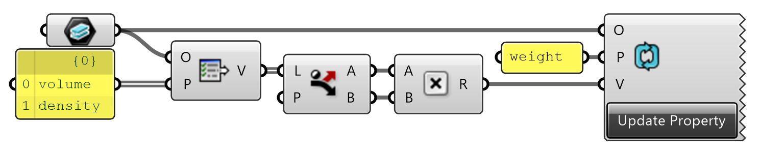 Step 2. Then, we can build the Grasshopper definition where we will need the Get Property component to retrieve the value of the volume and density parameters, multiply them and assign the result to the weight parameter using the Update Property component.