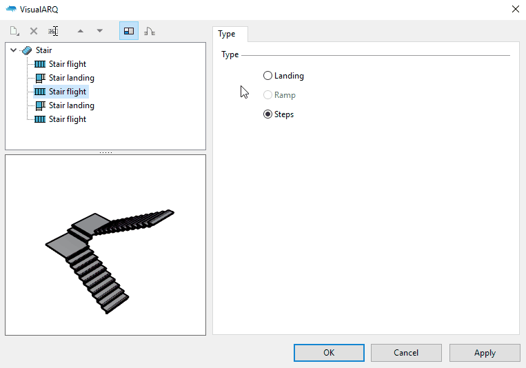 - Select each flight of the stair and define one of the two flight type options (landing or steps) from the Type tab.